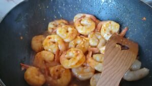 Na patelnię wrzucamy czosnek i chili, zwiększamy gaz, możemy dodać więcej oleju i jeszcze trochę masła, żeby wszystko trochę pływało, kiedy czosnek zacznie pachnieć dorzucamy krewetki, solimy wszystko do smaku, i na największym gazie wszystko szybko smażymy. Kiedy krewetki zmienią kolor na różowy i zrobią się okrągłe, uważajcie, żeby nie przeciągnąć, bo będą gumowate, zdejmujemy wszystko z ognia i gotowe. Układamy na talerzu i podajemy z grzankami.